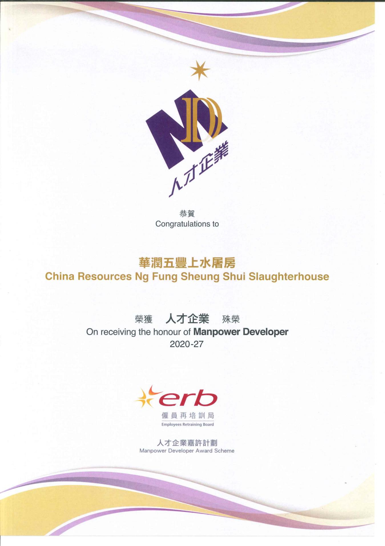 近日,华润五丰上水屠房获香港雇员再培训局“2020-27 erb人才企业嘉许计划”嘉许为“人才企业”。这是上水屠房连续第三次获此殊荣,彰显了企业在人才培育体系构建、员工职业发展支持及组织文化塑造方面的持续投入和卓越成效。
